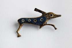 Objectnaam: Fibula Titel: Geėmailleerde Fibula in de vorm van een hond Samenvatting: Een fibula is een op de schouder gedragen kledingsspeld |