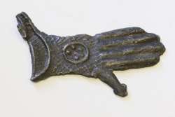 Objectnaam: Insigne Titel: bisschops handschoen Samenvatting: Het graf van Thomas Becket in Canterbury was een pelgrimsoord. Deze miniatuurhandschoen verwijst naar hem. De handschoenen van Bisschop St Thomas Becket behoorden tot de meest vereerde relikwieën in Canterbury, symboliserend de gezegende handen van de Heilige en zijn zuiverheid van dienst. Geloofd te beschikken over genezende krachten, vooral voor aandoeningen aan de handen en armen, inspireerden ze de productie van pelgrimsinsignes die de heilige handschoenen uitbeelden. Deze kleine souvenirs dienden zowel als devotionele tokens als herinneringen aan de wonderen die aan Becket’s bemiddeling werden toegeschreven. |
