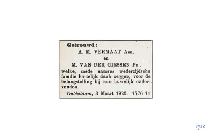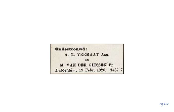 Vermaat; A.M. Giessen, van der; M. 19-2-1920 |