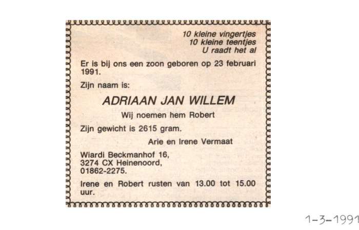 Vermaat; Adriaan Jan Willem ; 23-2-1991 |