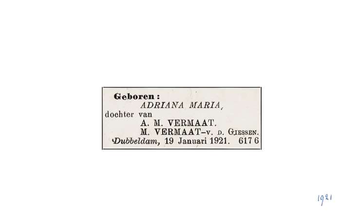 Vermaat; Adriana Maria ; 19-1-1921 |