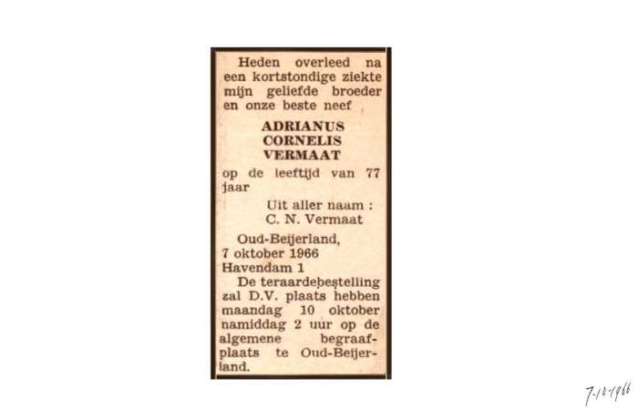 Vermaat; Adrianus Cornelis ; 7-10-1966 |