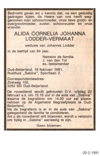 Vermaat; Alida Cornelia Johanna Lodder; Johannis 18-2-1991 |